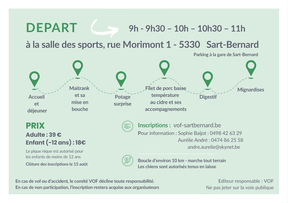 Le paiement valide votre inscription. Il se fait sur le compte IBAN : BE 52 06 82 47 08 63 09 en mentionnant votre nom, prénom, heure de départ et « Marche Gourmande 2025 ».
